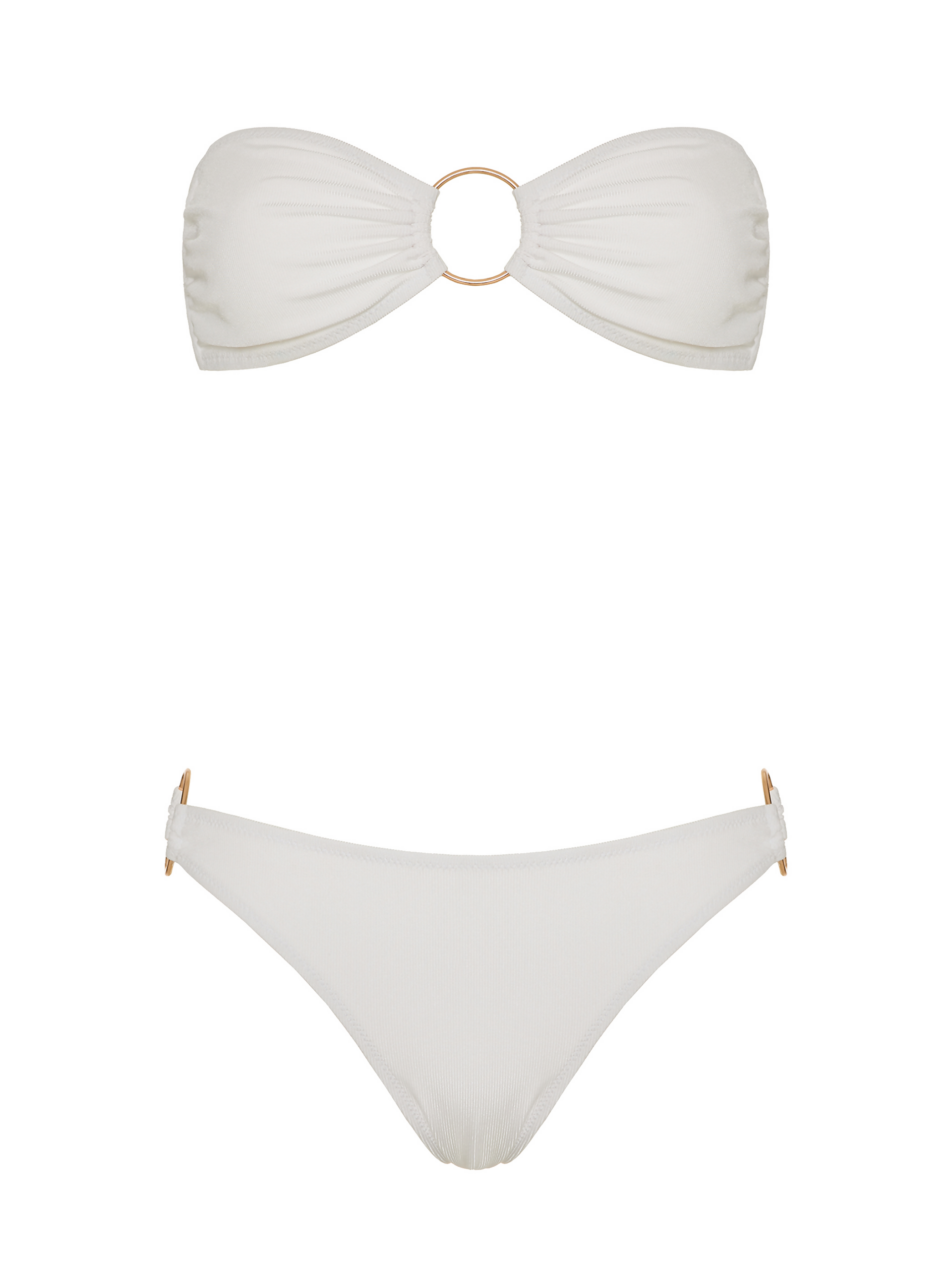 Our best-selling bandeau bikini Amanda is cut from a white ribbed fabric and is embellished with metallic rings in matte white color. This new take defines beach chic.