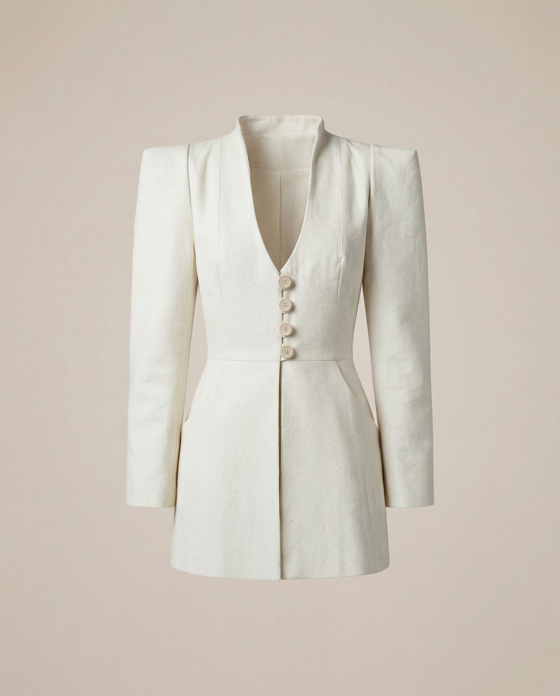 A fit-and-flare jacket featuring a stand-up collar and a V neckline. 4 wooden buttons on the front, slanted pockets at both sides. Geometrical arm tops. Lined with our copyrighted pattern.