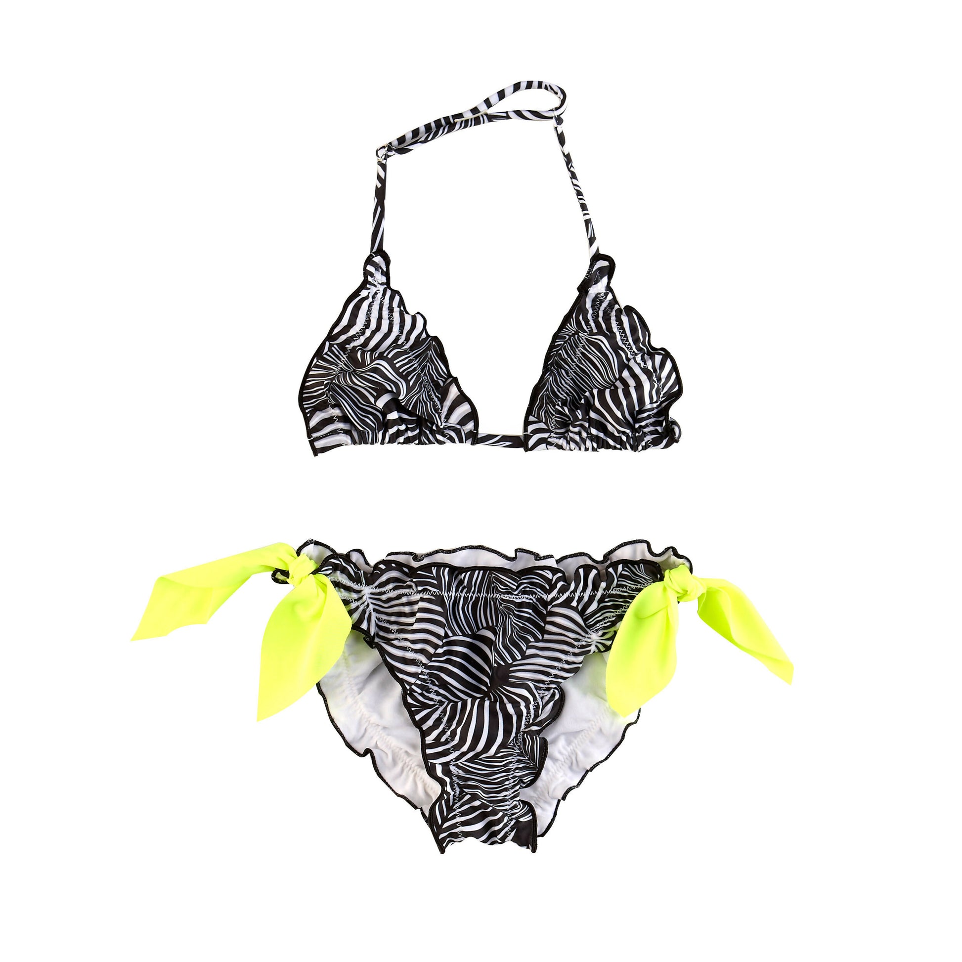 Black and white print, girls bikini with frou frou details and UPF 50+ sun protection. Featuring a stylish triangle cut and a neon yellow detachable bow detail on the swim bottoms. Match it with mommy and daddy for the perfect look.