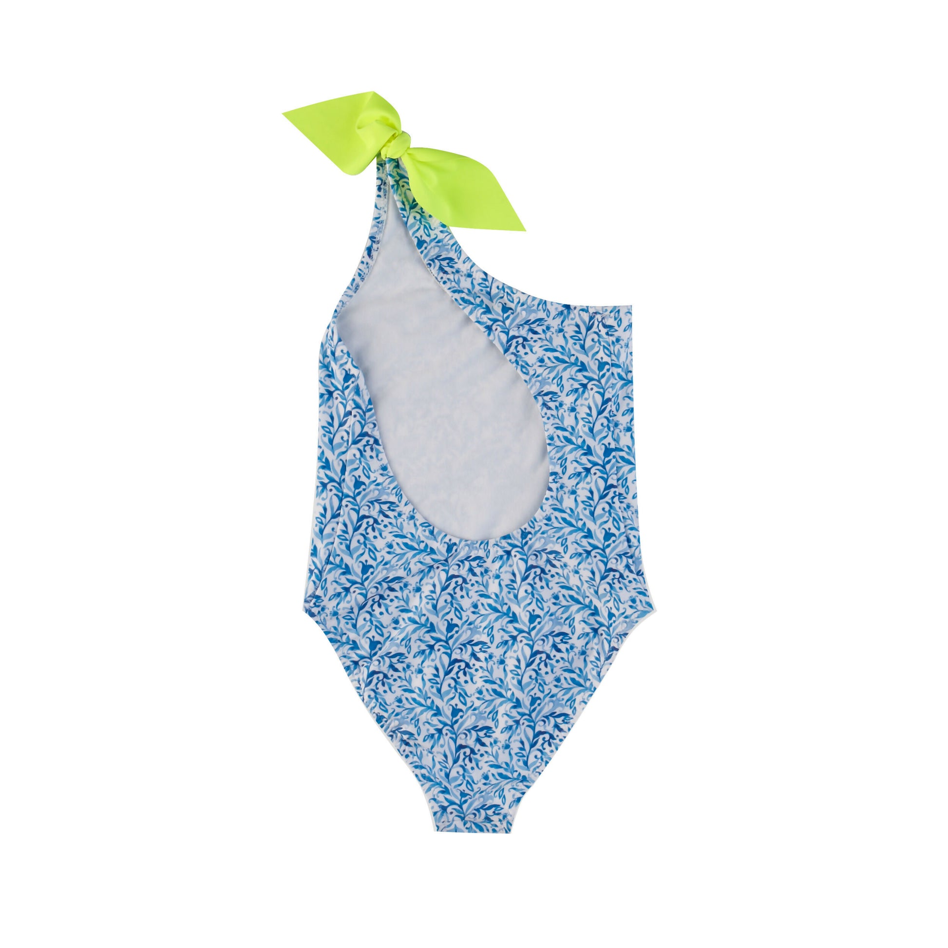 Indie print, blue and white flowers, one piece swimsuit with one shoulder and UPF 50+ sun protection. Featuring a stylish cut out back and a neon yellow bow detail on the shoulder. Match it with mommy and daddy for the perfect look.
