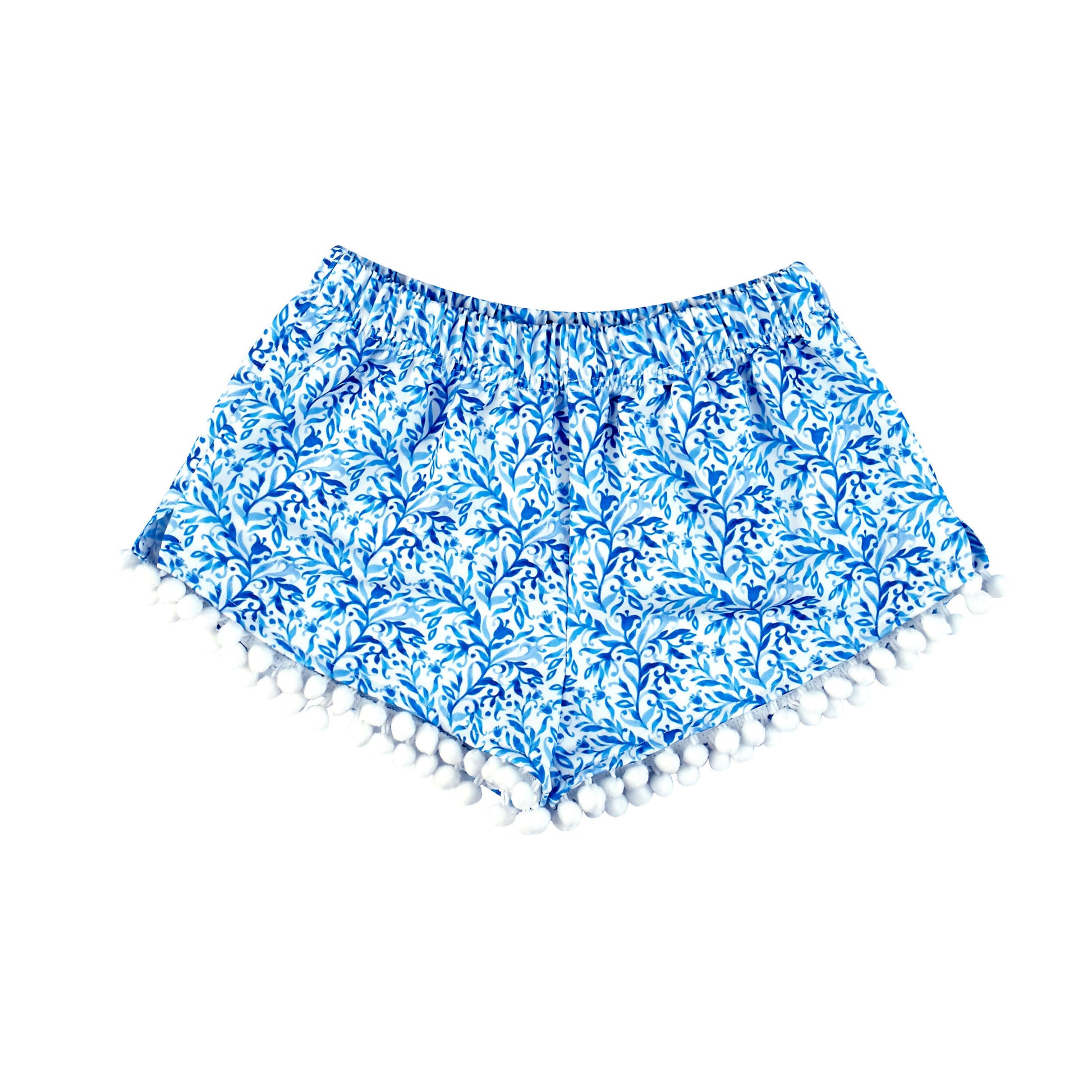 Indie print girls beach shorts with blue and white flowers, featuring an elasticated waist and decorative white pom pom. It has a relaxed fit and side detail dolphin hem. Your little girl will love it for its comfort and beautiful design! Pair it with our coordinating swimsuits. Match the pattern with mommy and daddy for a perfect family matchy-matchy picture!