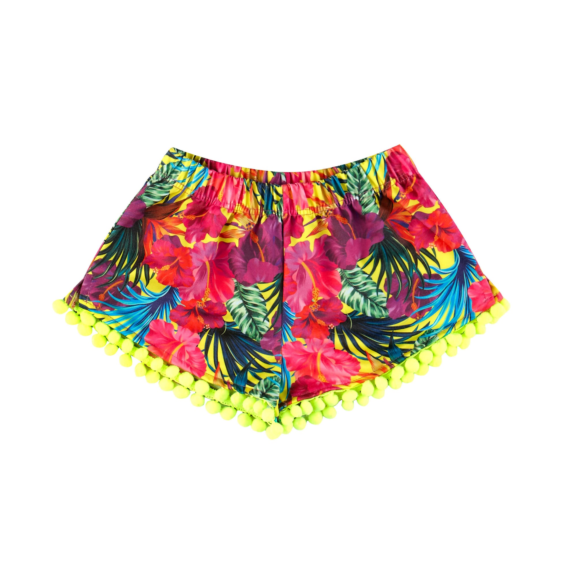 Tropical flowers girls beach shorts featuring an elasticated waist and decorative neon yellow pom pom. It has a relaxed fit and side detail dolphin hem. Your little girl will love it for its comfort and beautiful design! Pair it with our coordinating swimsuits. Match the pattern with mommy and daddy for a perfect family matchy-matchy picture!