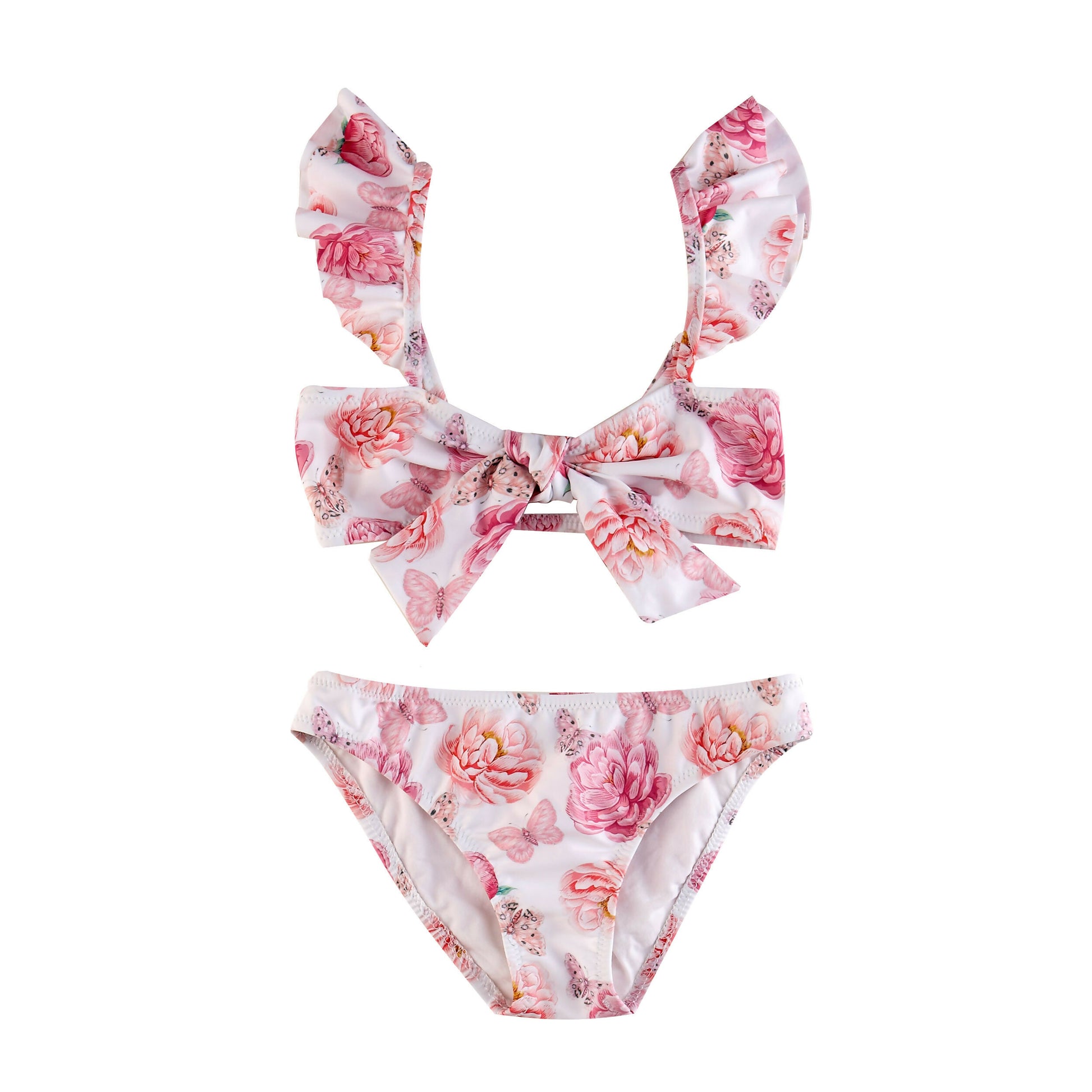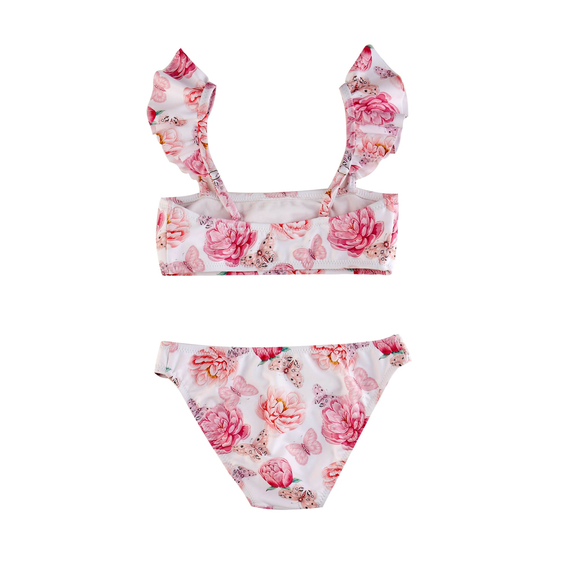 Romantic print with peonies and butteflies two-piece girls bikini, with a bandeau neckline, ruffles on the straps and UPF 50+ sun protection. Featuring a stylish detachable tie knot/bow on the front and a coordinating romantic swim bottom. Pair it with its matching shorts or kaftan for a total beach look.