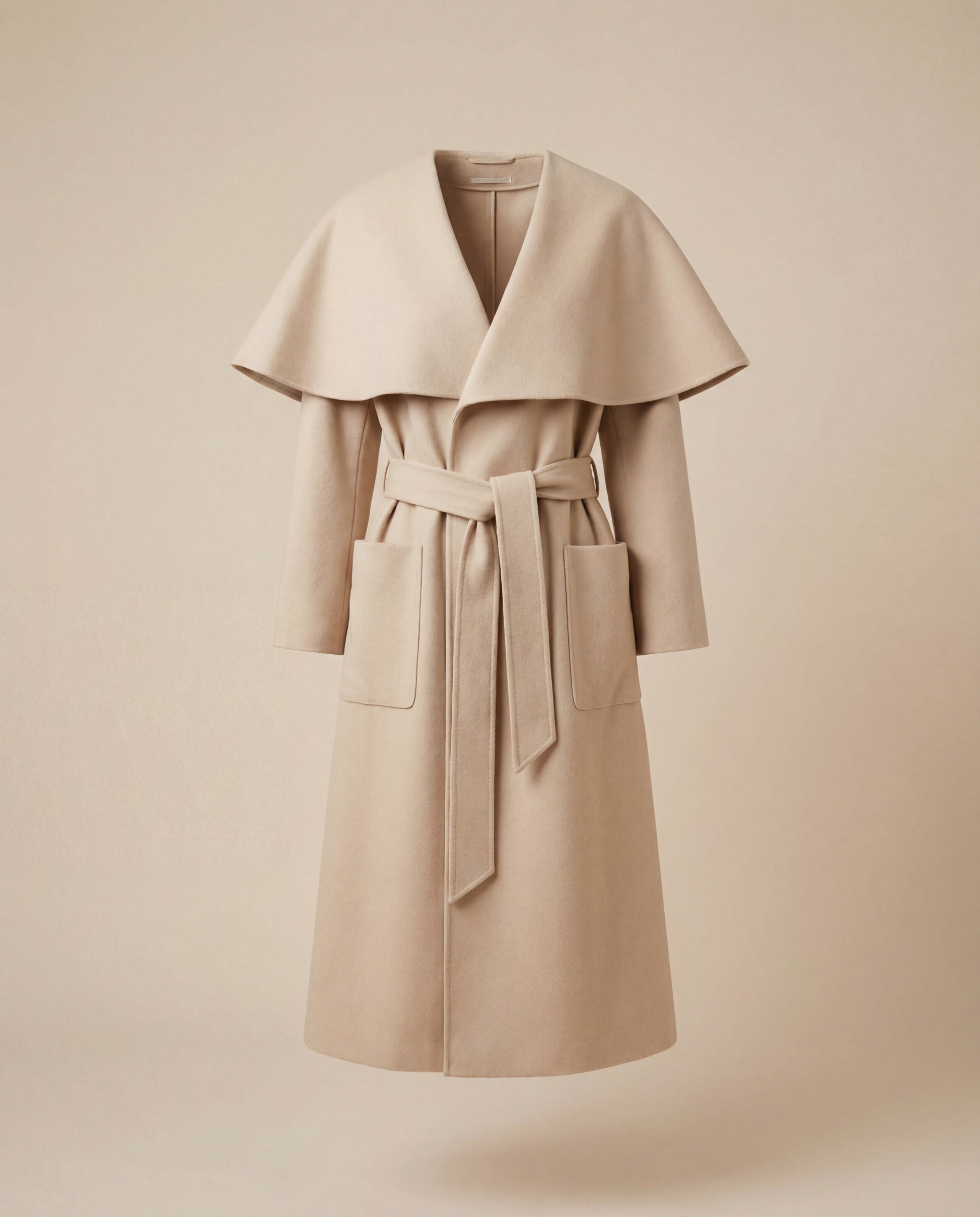 Maxi long-sleeved mantel coat with no buttons. Wide classic lapels in the front transformed into an arm-covering mantel. Wide, ultra long material belt. Classic square side pockets. Long slit at the back. Lined with our copyrighted pattern.